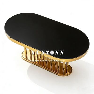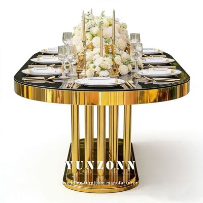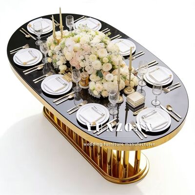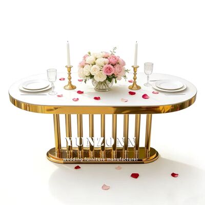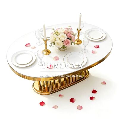 | اسم المنتج: | أثاث زفاف بالجملة ذهبي إطار من الفولاذ المقاوم للصدأ بيضاوي زجاج أبيض مرآة سطح طاولة طويلة طعام فندق طاولة زفاف |