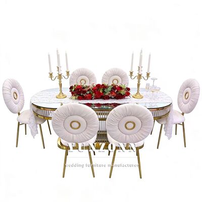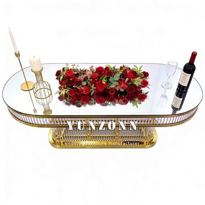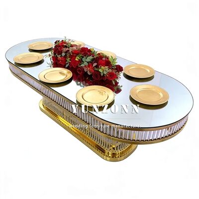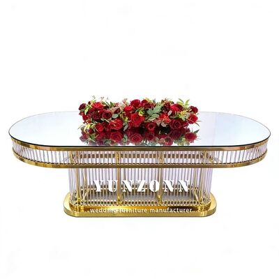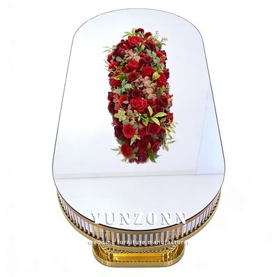 | اسم المنتج | الرفاهية الحديثة القابلة للاستمرار بيضاوية الشكل الزخرفية الإطار الفولاذ المقاوم للصدأ الزجاج المقاوم أعلى طاولة الزفاف للمطعم |