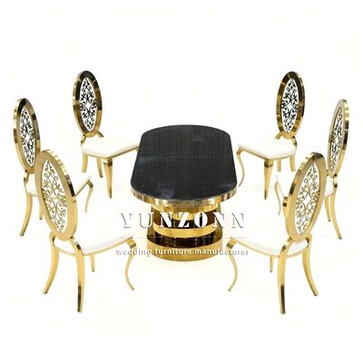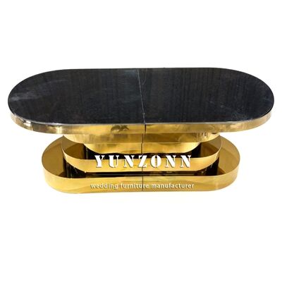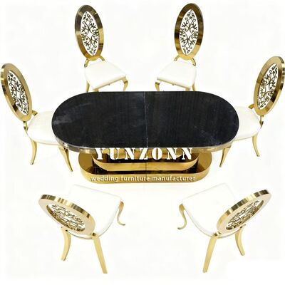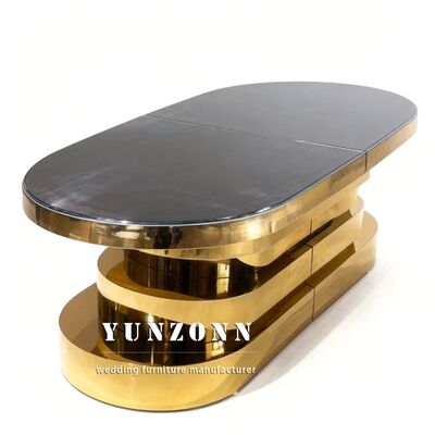 | اسم المنتج: | طاولة طعام فاخرة من الفولاذ المقاوم للصدأ الذهبي مع سطح زجاجي مرآة لحفلات الزفاف |