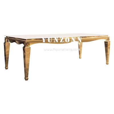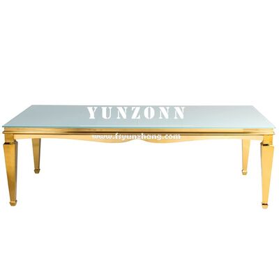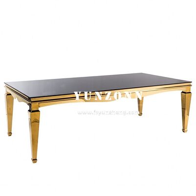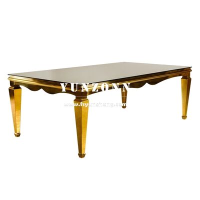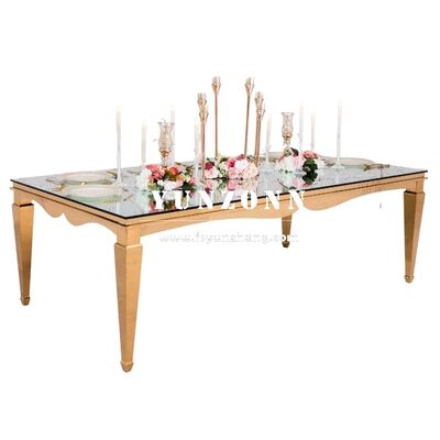 | اسم المنتج: | طاولة طعام حديثة من الفولاذ المقاوم للصدأ الذهبي مع سطح زجاجي عاكس للاستخدام في الفنادق وحفلات الزفاف والمناسبات الخارجية وطاولات الولائم |